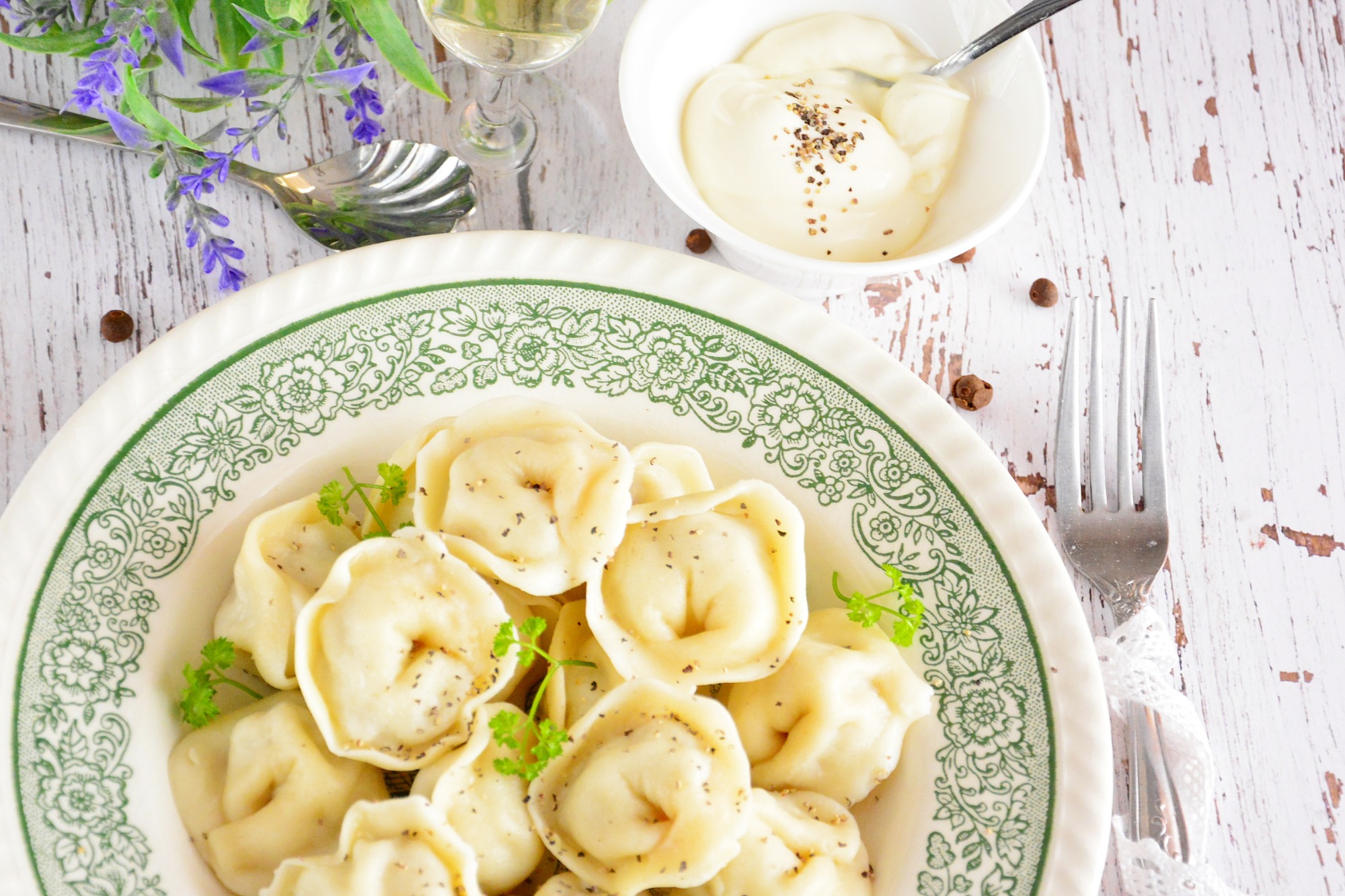 soczyste duży pielmieni z wieprzowiną, masłem, octem i śmietaną -
